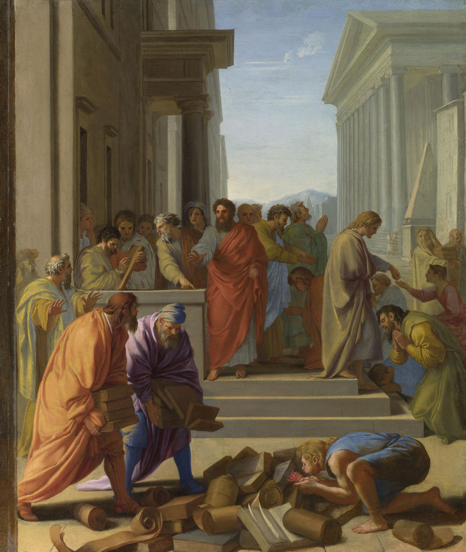 L’immagine è La predicazione di San Paolo a Efeso, un dipinto di Eustache Le Sueur realizzato nel 1649, conservato a Londra, presso The National Gallery, (Immagine nel pubblico dominio, tramite Wikiꝏ).