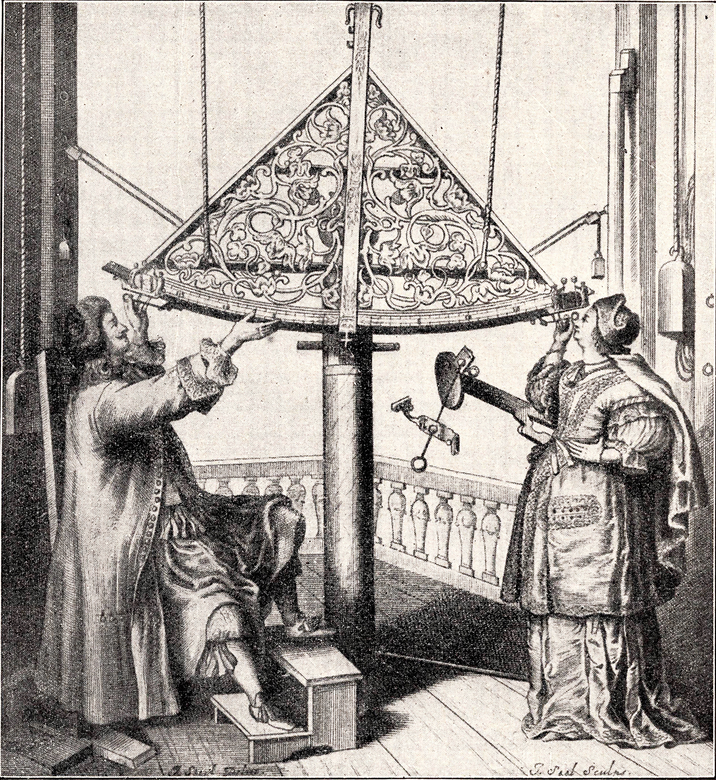 L’immagine è un'incisione tratta dal libro Machina Coelestis di Johannes Hevelius (1611-1687), stmpato a Danzica in due volumi tra il 1673 e il 1679. L'immagine mostra l'astronomo tedesco Hevelius e sua moglie Elisabeth mentre fanno osservazioni (immagine nel pubblico dominio, tramite Wikimedia Commons).