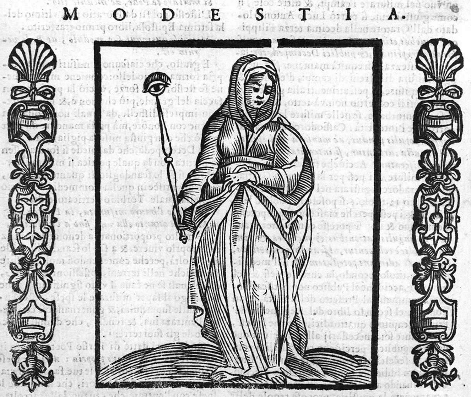 Nell'immagine, "La modestia", incisione a xilografia (artista ignoto) tratta da una delle tante edizioni dell'Iconologia di Cesare Ripa. Questa edizione fu stampata a Padova nel 1624, a cura di Pietro Paolo Tozzi (immagine dal Catalogo Generale dei Beni Culturali, concesssa con licenza CC-BY 4.0).