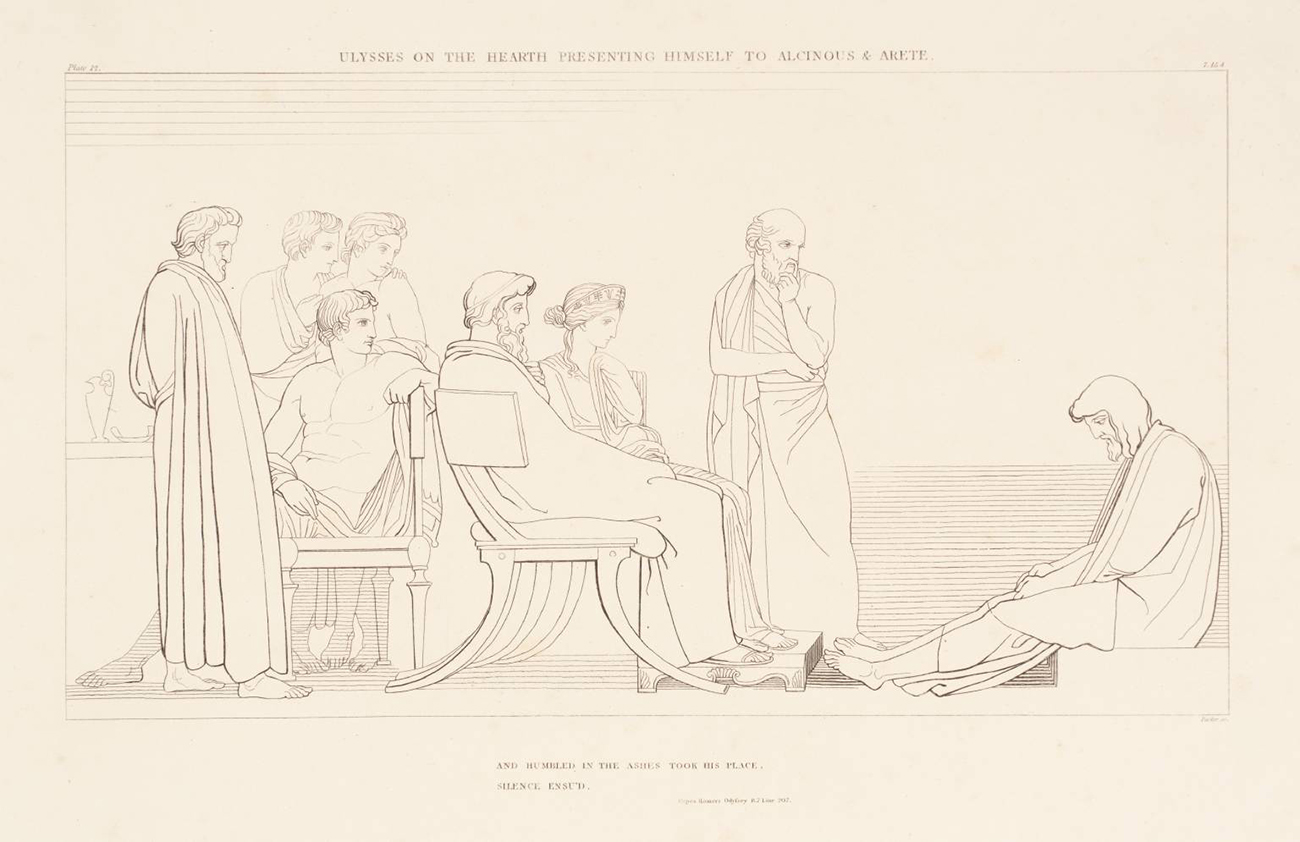 L’immagine è “Ulysses on the Hearth Presenting Himself to Alcinous and Arete”, (Ulisse al focolare si presenta ad Alcinoo e Arete), acquaforte su carta di John Flaxman, realizzata nel 1805 per le illustrazioni a “The Odyssey of Omer”, oggi conservata presso la Tate Gallery di Londra (Photo © Tate concessa su licenza CC-BY-NC-ND 3.0 (Unported).