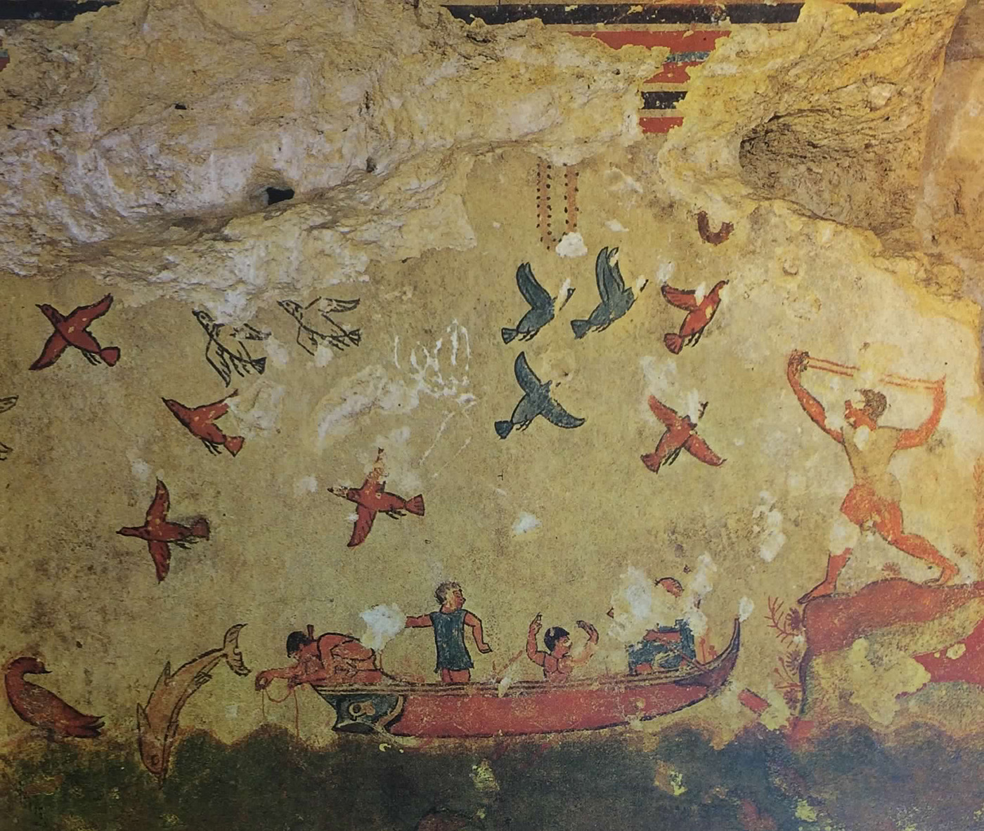 Nell’immagine “Tomba della caccia e della pesca”, pittura presente in una tomba a camera ipogea di Tarquinia, realizzata tra il 520 e il 510 a. C. da un pittore greco, sotto la tutela della Soprintendenza Archeologia, Belle Arti e Paesaggio per l'area metropolitana di Roma, la provincia di Viterbo e l'Etruria meridionale (Foto © Catalogo generale dei Beni Culturali, licenza CC BY-NC-SA 3.0 IT).